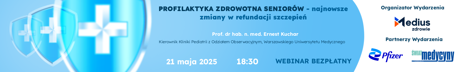 już 21 maja o godzinie 18:30 zapraszamy Państwa do udziału w BEZPŁATNYM webinarze medycznym poświęconym tematyce najnowszych zmian w refundacji szczepień seniorów pt. “PROFILAKTYKA ZDROWOTNA SENIORÓW – NAJNOWSZE ZMIANY W REFUNDACJI SZCZEPIEŃ”.